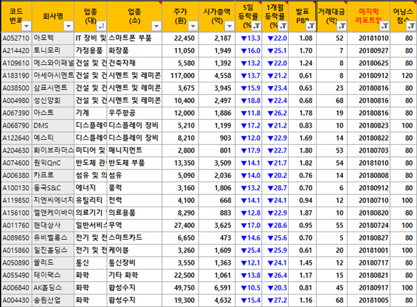 - 5일간 등락율을 -10%이하로 하락한 기업과 1개월간 등락율-20%이하로 하락한 기업을 찾는다.